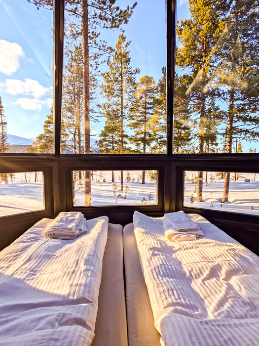 Suurista panoraamaikkunoista – ja jopa suoraan sängystä – voit ihailla pohjoisen taivaan ihmeitä. Kirkkaana yönä taianomaiset revontulet tanssivat aivan yläpuolellasi. Rauhallinen luonto ja loimuavat revontulet luovat unohtumattoman tunnelman yöpymiselle.